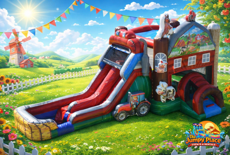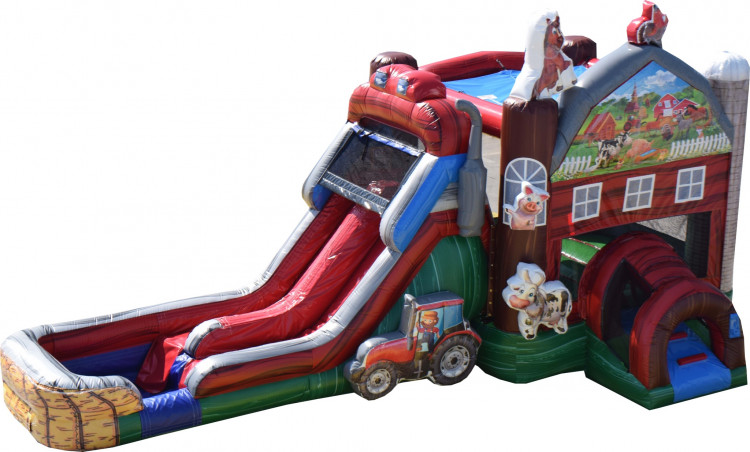 Chickens, Pigs, Cows, Horses, Donkeys, Ducks, Rabbits, a Tractor and Barn... oh my! This farm combo features a double lane slide with pool, big bounce area and a basketball hoop inside. WET/DRY