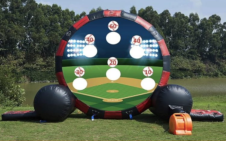 Step up your game—literally—with the Soccer Darts 4 in 1 Game! This ultimate rental combines the thrill of soccer with the precision of Sticky Balls and a Velcro Target. It's a giant inflatable target that invites you to kick soccer balls and aim for bullseye glory. Designed to entertain all ages, it's not just about accuracy; this bounce rental also features three other interactive game modes for non-stop fun.  The back side offers a Baseball Throw and the sides feature tic tac toe and a bean bag drinking game.  The side games can be folded in if there is limited space or you do not wish to offer those games.  Whether at a backyard party or a school event, this fusion of sports is sure to draw crowds and amplify excitement. Get ready to kick, aim, and score!